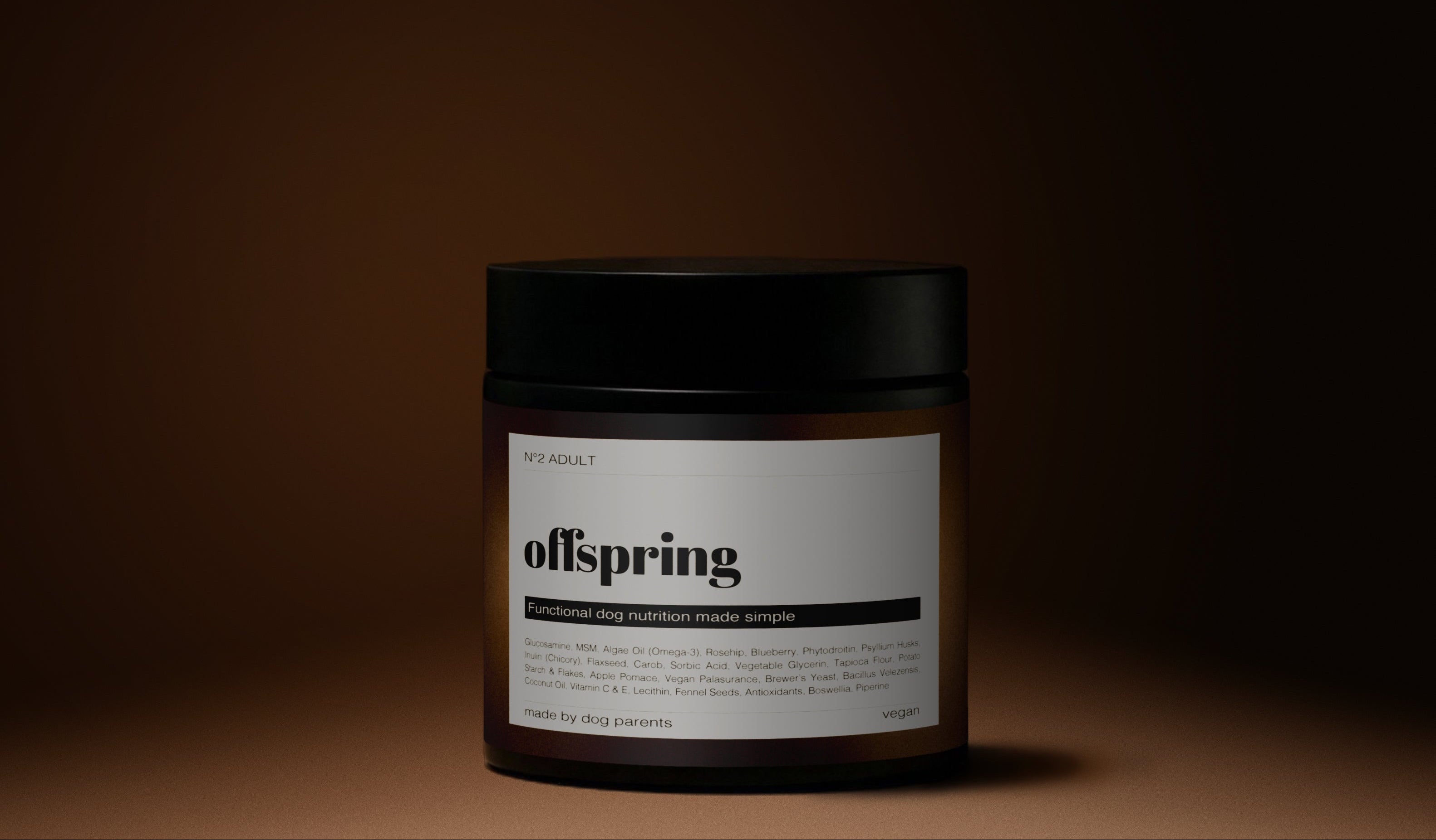 offspring N°2 ADULT versorgt den Organismus deines Hundes täglich mit funktionalen Inhaltsstoffen, die Gelenke, Verdauung, Immunsystem, Kognition sowie Haut und Fell unterstützen.